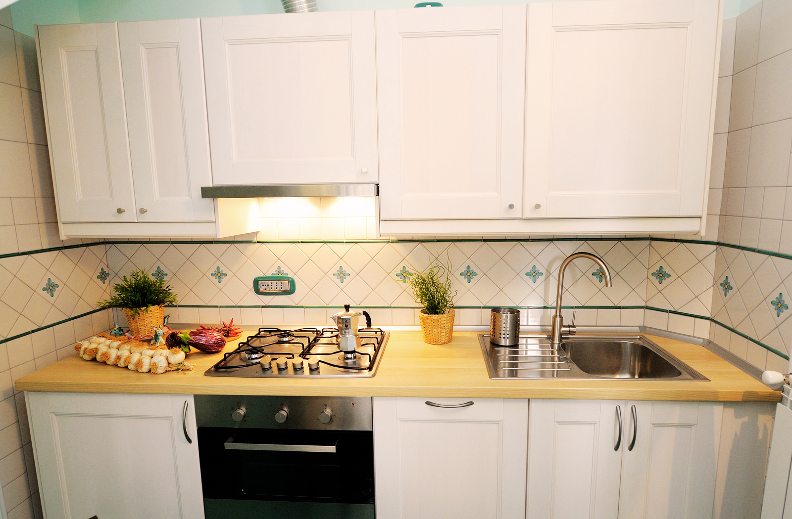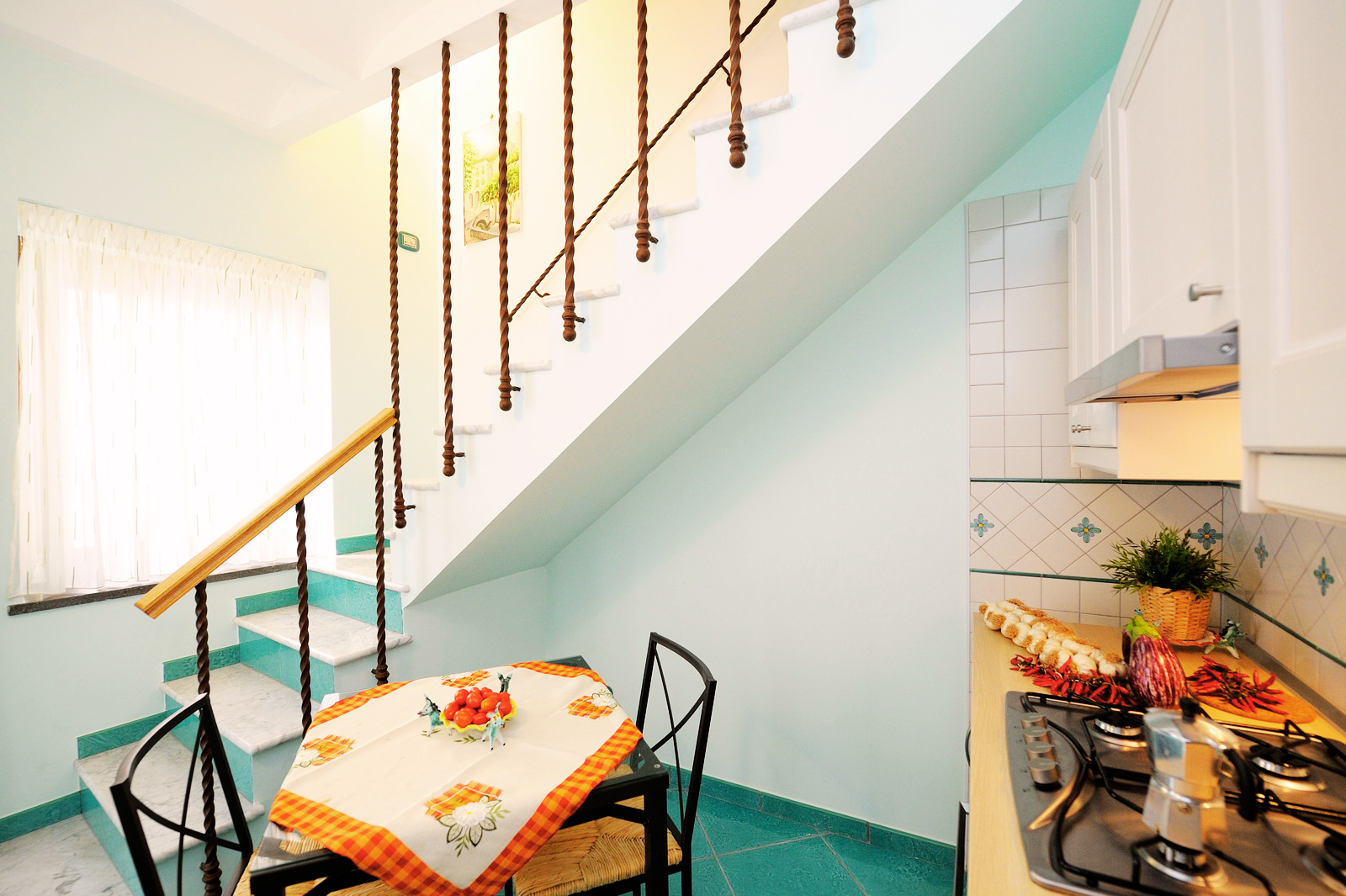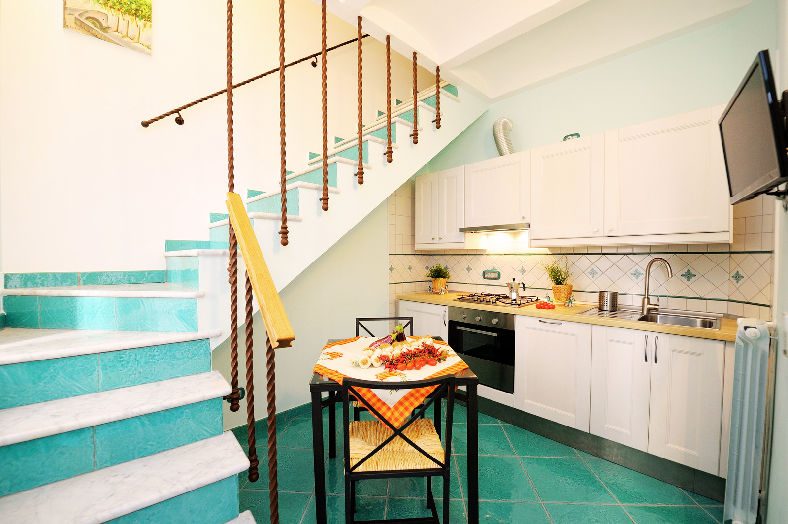 L’appartamento dispone di una cucina attrezzata; un bagno con ampio piano doccia e bidet; una camera da letto soppalcata con letto matrimoniale e, sempre nello stesso ambiente, un comodo divano letto per due persone. Per accedere all’appartamento è necessario salire una breve rampa di scale di 15 gradini.