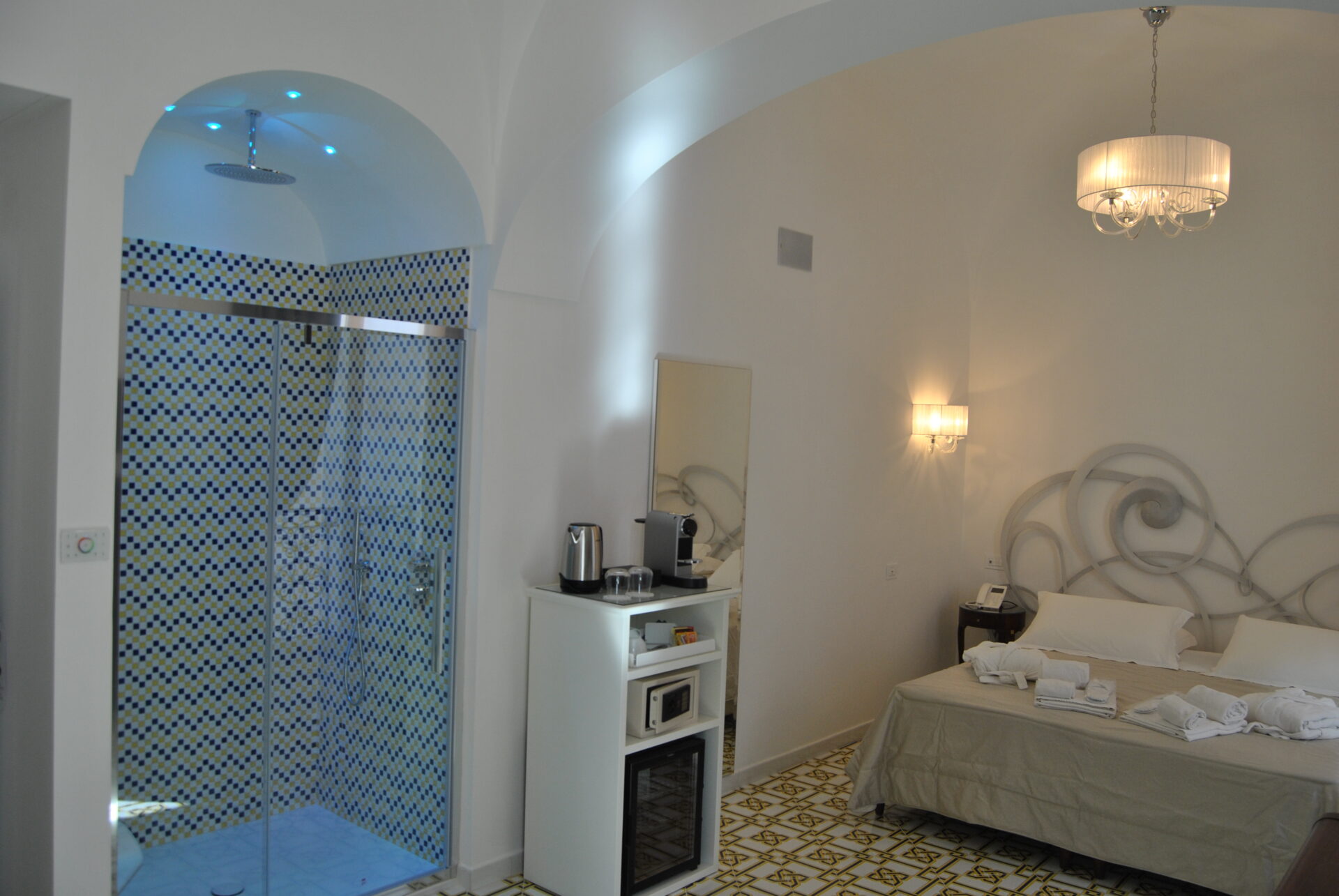 Die Zimmer wurden mit großer Sorgfalt eingerichtet, wobei besonderes Augenmerk auf Details, Komfort und Wohlbefinden gelegt wurde. Handgefertigte Böden aus Vietri-Porzellan, Kingsize-Doppelbetten mit einem eleganten und bequemen schmiedeeisernen Kopfteil, Klimaanlagen, Armaturen und Ladestationen für Geräte sind das Ergebnis einer sorgfältigen Recherche, die von dem Wunsch geleitet wird, den Urlaub der Gäste einzigartig und unvergesslich zu machen.