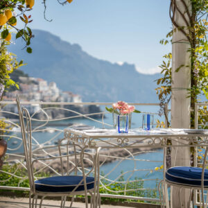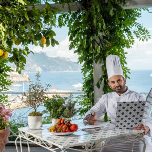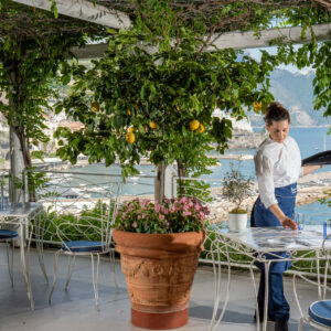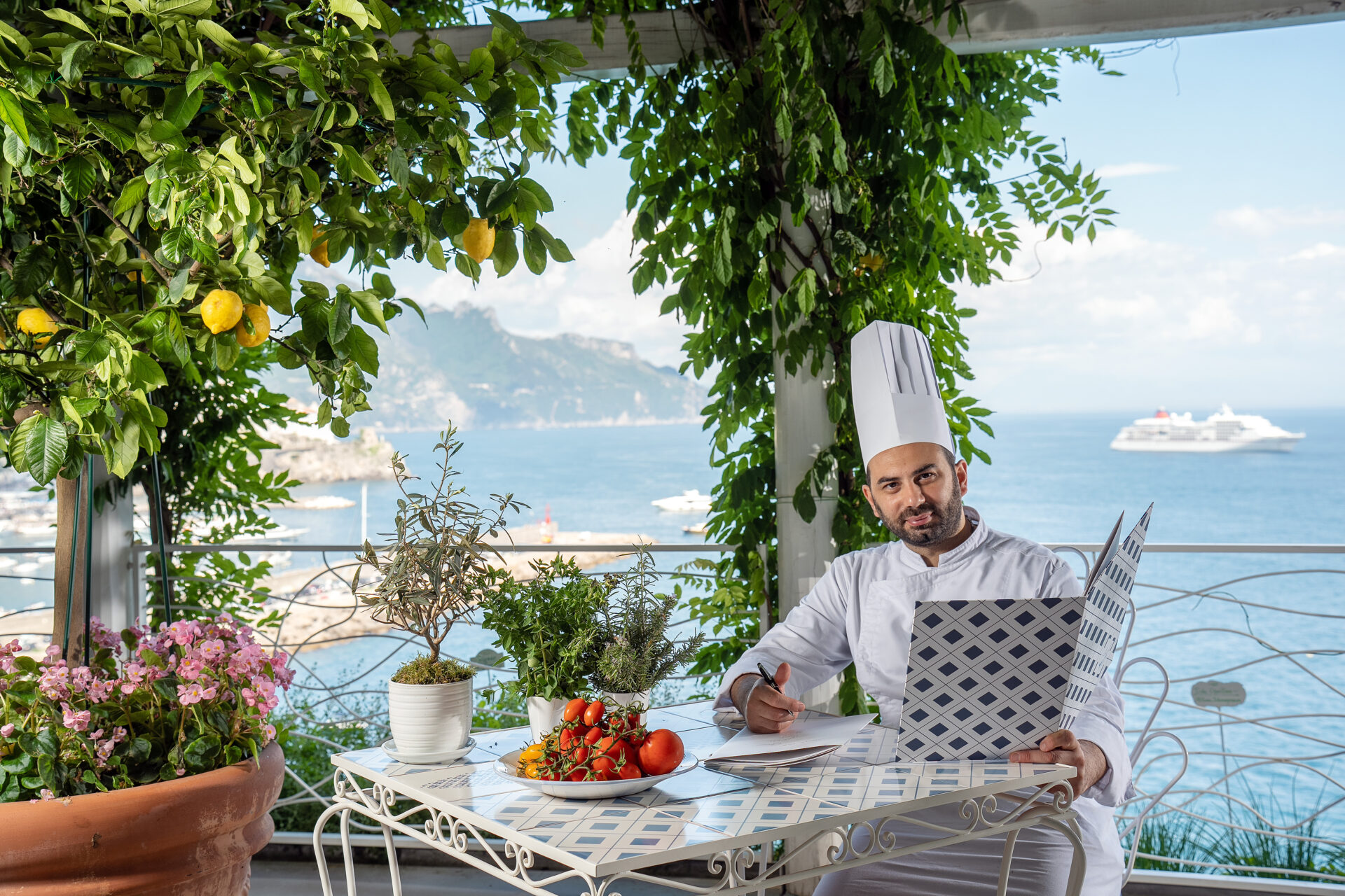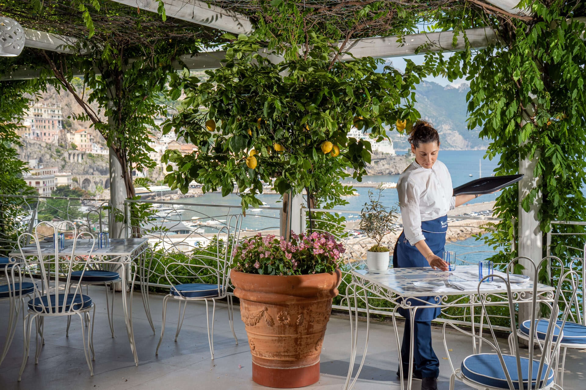 Das Restaurant Sauté befindet sich im zauberhaften Hotel Miramalfi auf einer Panoramaterrasse mit Blick auf das Meer, umhüllt vom Duft einer üppigen Pergola mit immergrünen Pflanzen, die das Bild eines idealen Ortes für ein schmackhaftes und informelles Mittagessen vervollständigt.