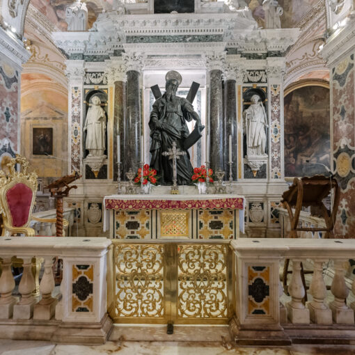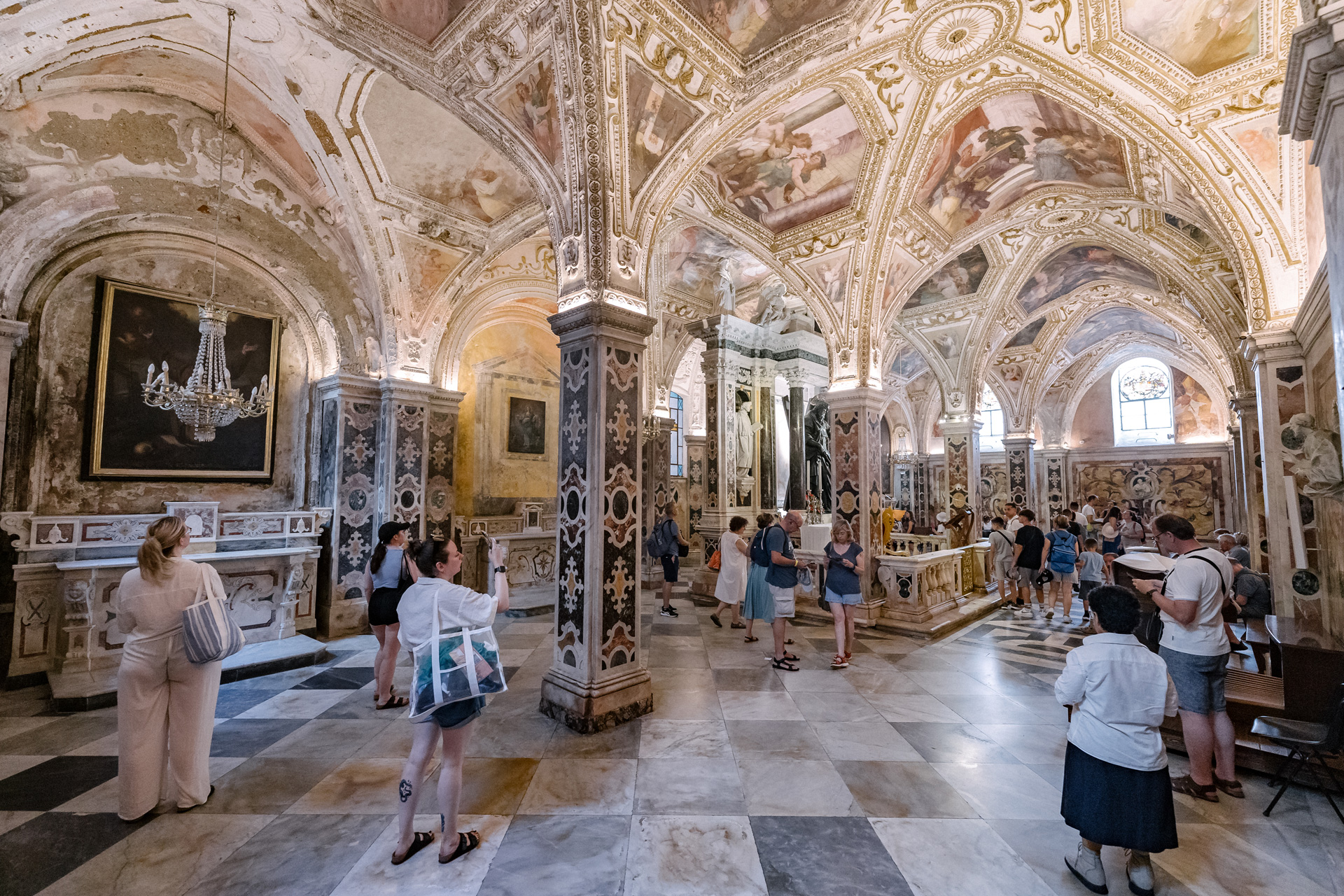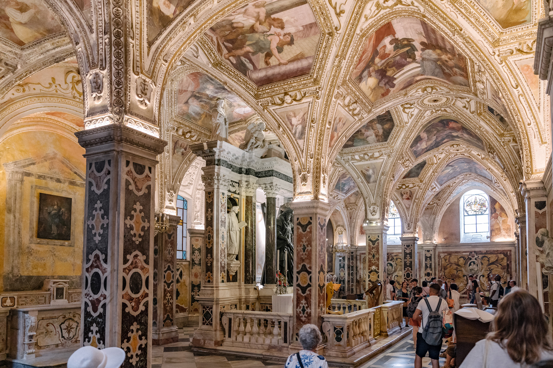 Die Krypta des Monumentalkomplexes der Kathedrale von Amalfi wurde zu Beginn des 13. Jahrhunderts auf Veranlassung von Kardinal Pietro Capuano errichtet, der am 8. Mai 1208 die sterblichen Überreste des Schutzpatrons von Amalfi, des Heiligen Andreas, nach seiner Rückkehr vom Vierten Kreuzzug direkt aus Konstantinopel hierher brachte. Der Altar und die Bronzestatue des Heiligen Andreas, die von Michelangelo Naccherino, einem Schüler Buonarrotis, geschaffen wurde, wurden um das Grab des Heiligen herum errichtet, das sich in der Mitte der Krypta befindet. Die reich geschmückte Krypta beherbergt auch zwei Marmorskulpturen von Pietro Bernini, die den Heiligen Stephanus und den Heiligen Lorenzo darstellen. Mit der Krypta verbunden ist das Wunder des Manna des Heiligen Andreas.