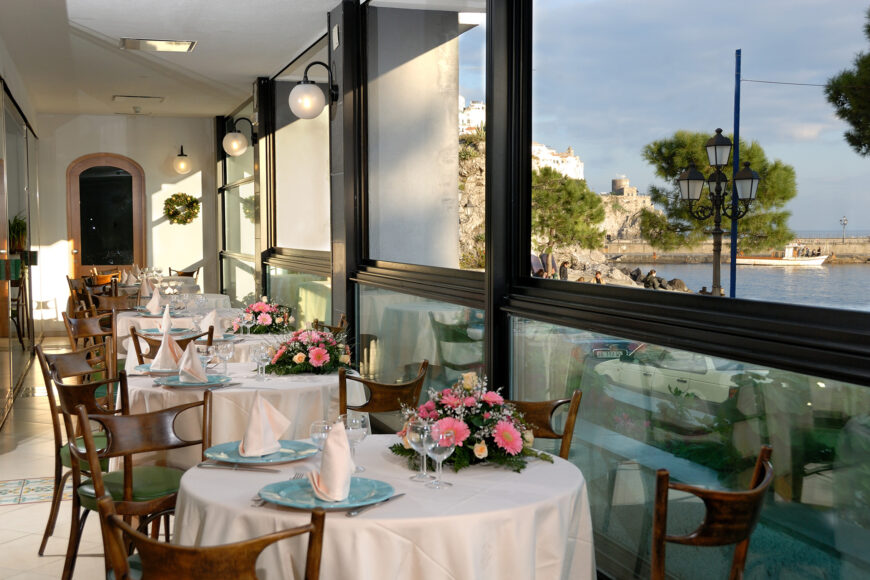 The restaurant, with two rooms that directly overlook Amalfi’s seafront, is the ideal location for any circumstance, whether it be a formal lunch, an elegant dinner, or the perfect location to live out with loved ones the dream of a relaxing and welcoming Amalfi Coast wedding.
