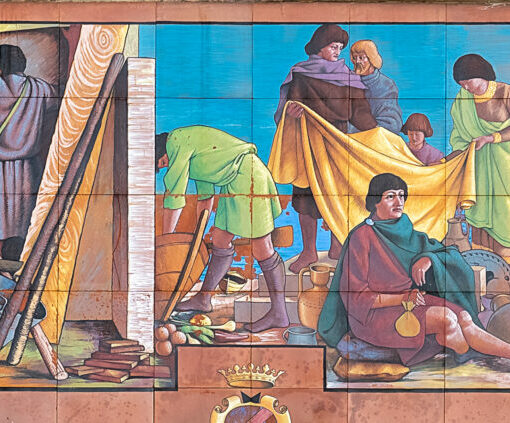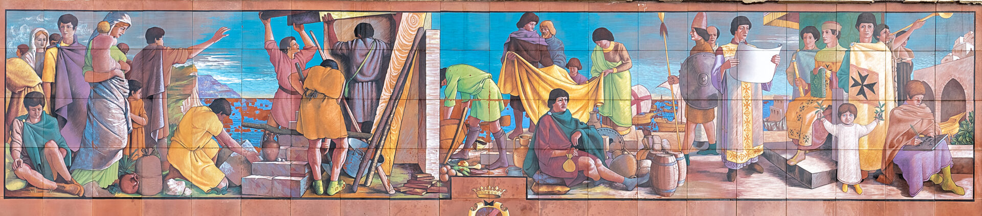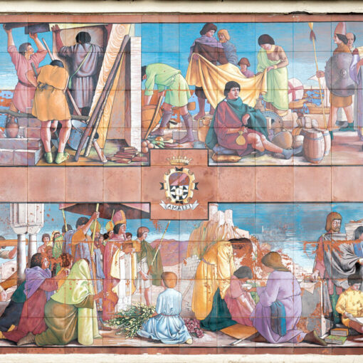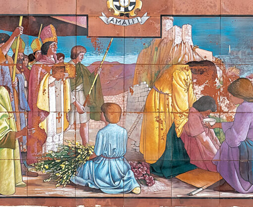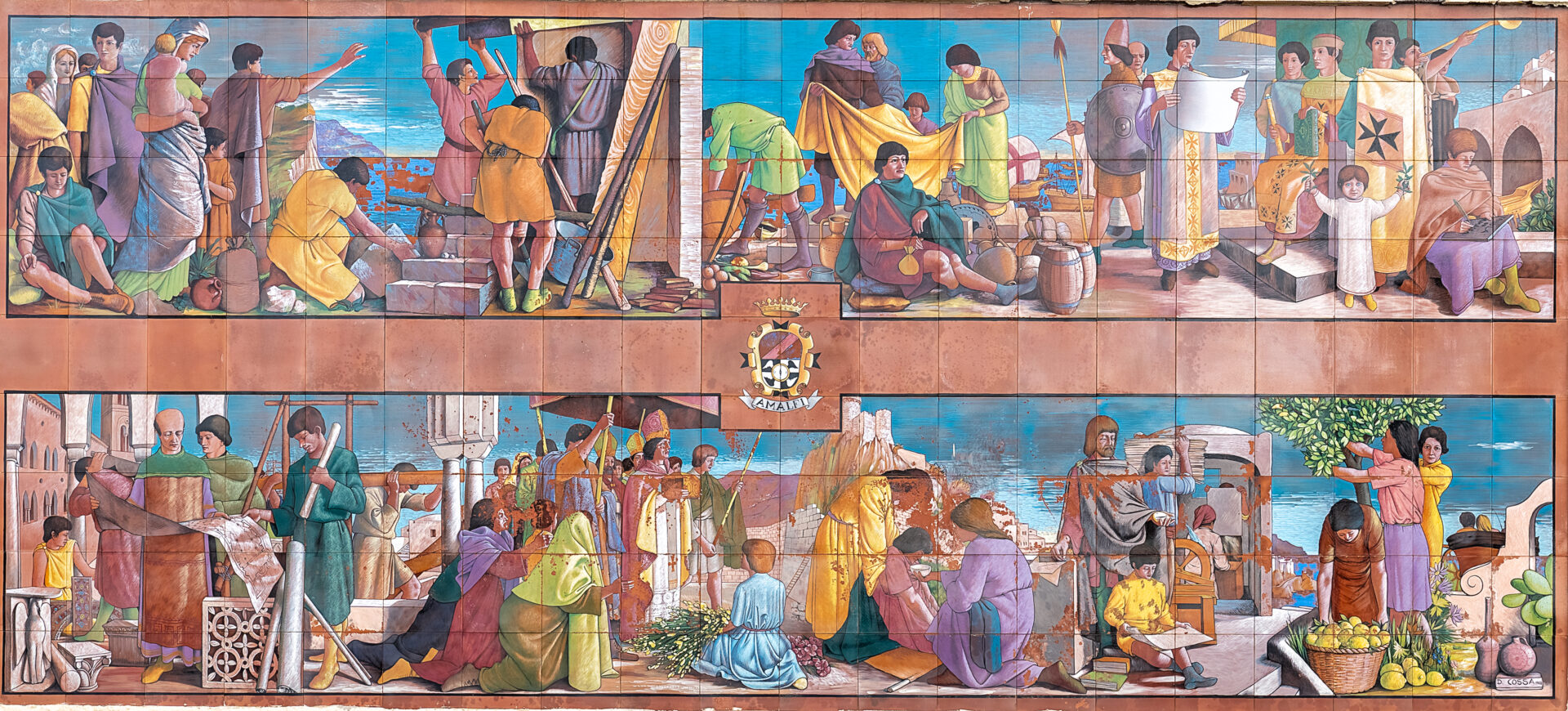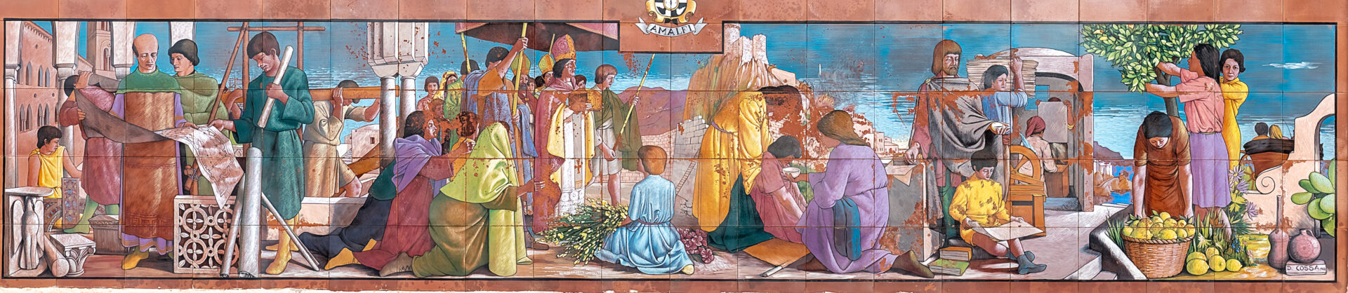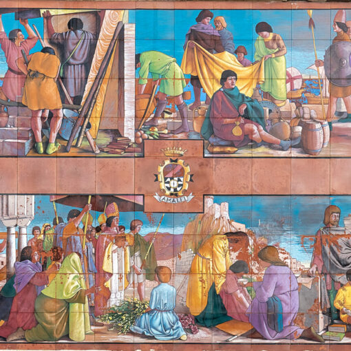 The ceramic panel by Diodoro Cossa, a pupil of ceramist Renato Rossi, in 1968, depicts the history of Amalfi. In the upper section, starting from the left, it shows the significant stages of the Maritime Republic’s foundation, trade with the East and the role of medieval Amalfi in the Mediterranean area. The lower section shows the construction of Amalfi’s most important buildings, such as the cathedral bell tower, the columns of Chiostro Paradiso, and the marble pulpit with peacock.