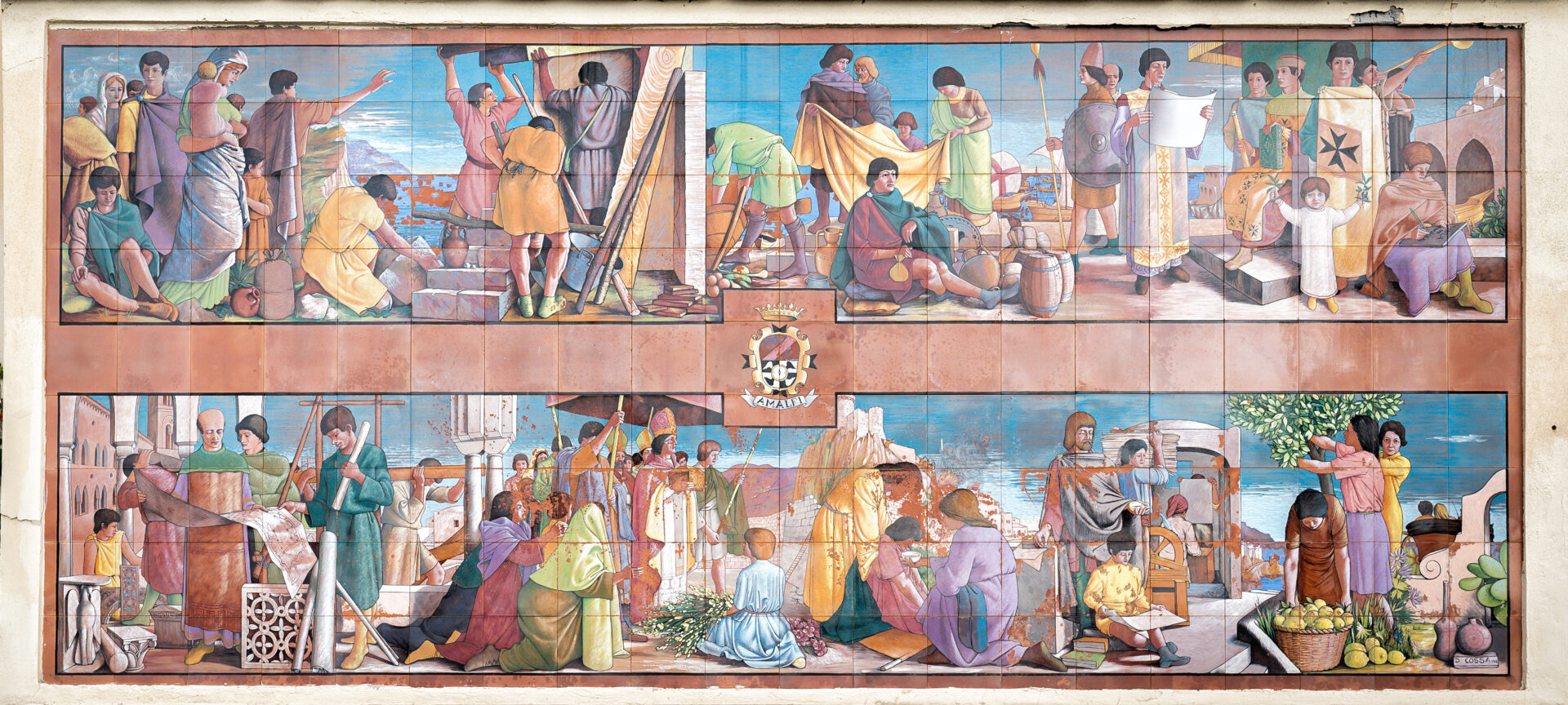 Next to it, the panel depicts Cardinal Pietro Capuano carrying the remains of St. Andrew the Apostle from Constantinople, the looting and plagues of the 14th century, Flavio Gioia and handmade papermaking. The last scenes illustrate the cultivation of lemons and end with the auspicious message of the carriage taking a married couple away towards a serene future.
