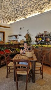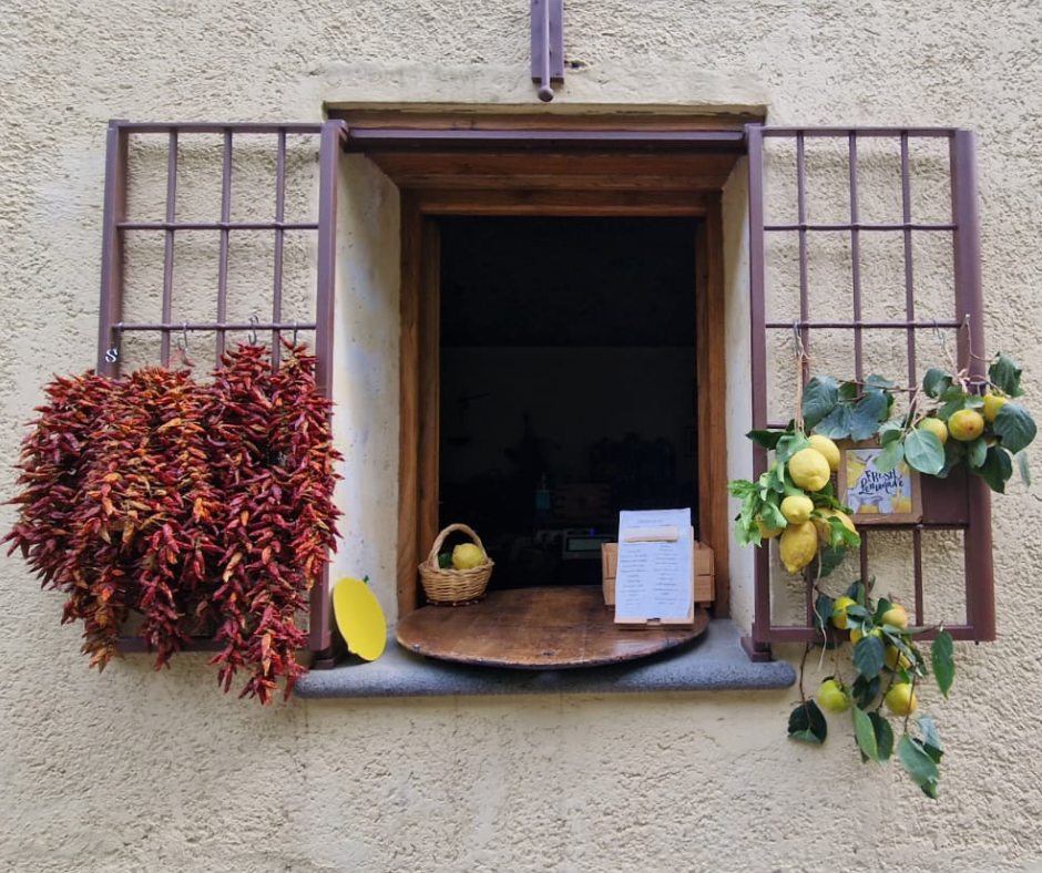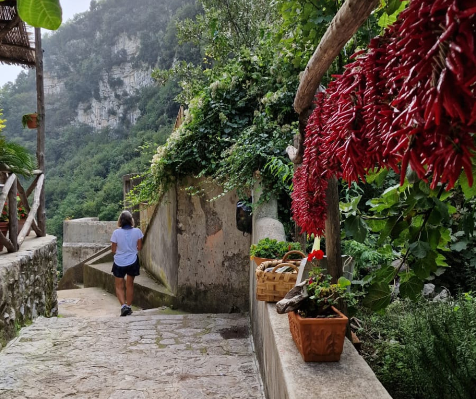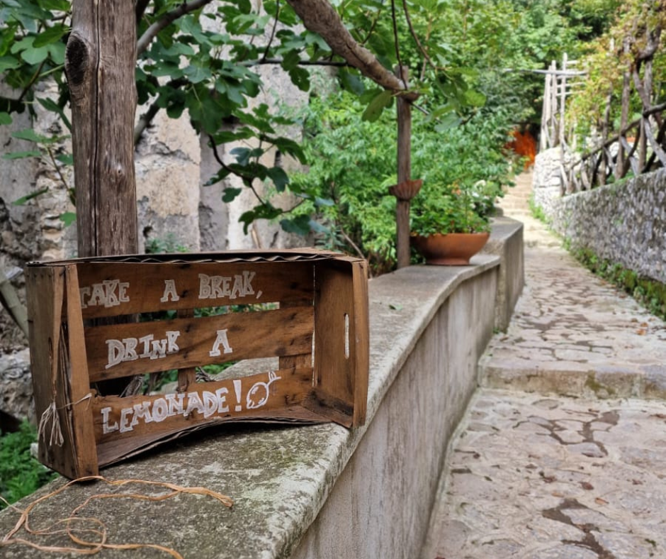 Alcanzar el tanque de Amalfi, continuando hacia la derecha, llegamos a Agricola Fore Porta, un lugar que transmite inmediatamente una sensación de tipicidad y autenticidad. Cuerdas de guindillas rojas colgando de las ramas, cestas con calabazas de todo tipo, una baldosa de cerámica pintada con las palabras“limonada fresca“, (que después de la escalada es realmente un remedio).
