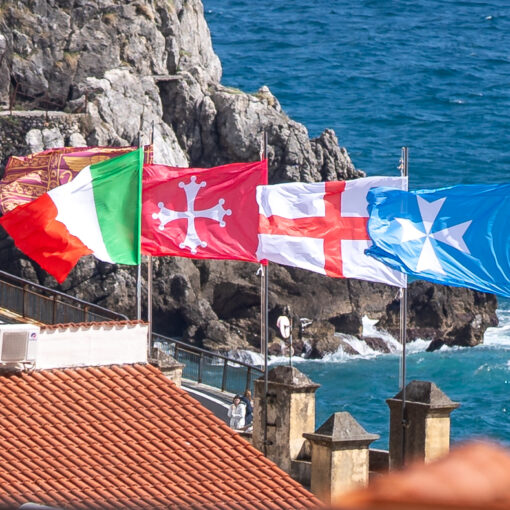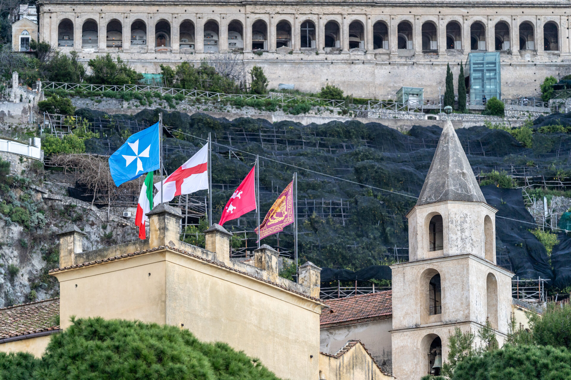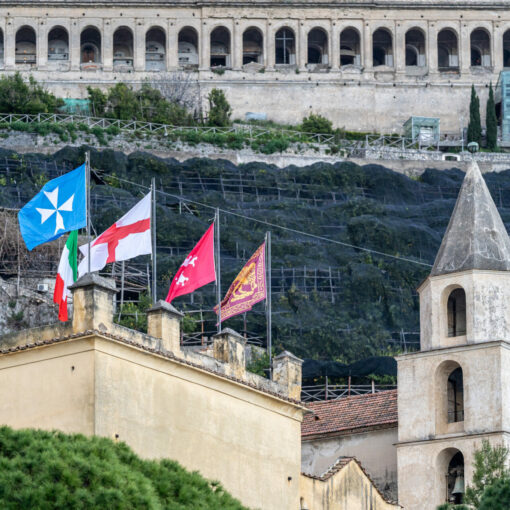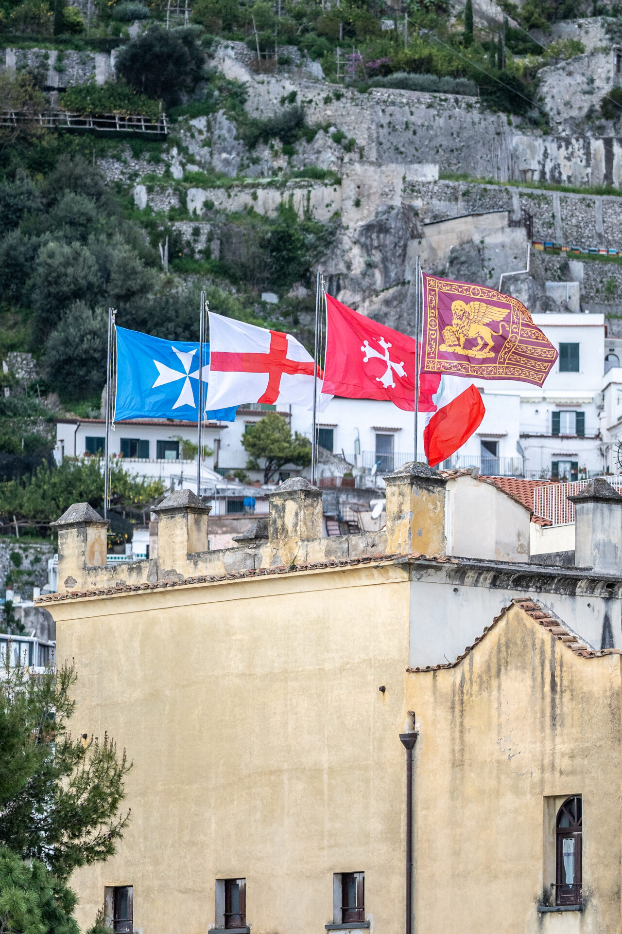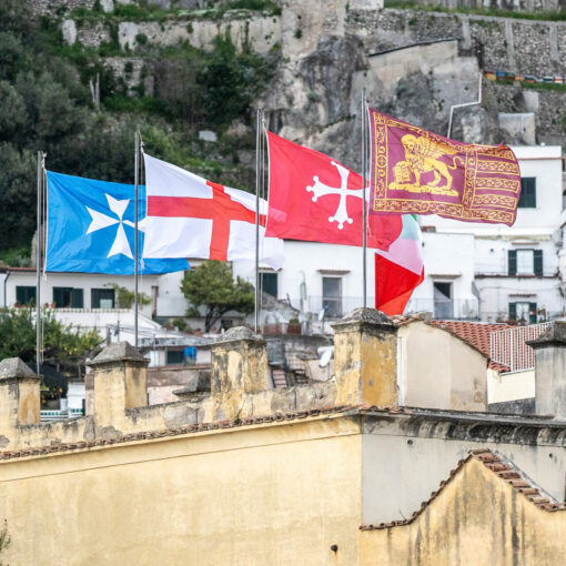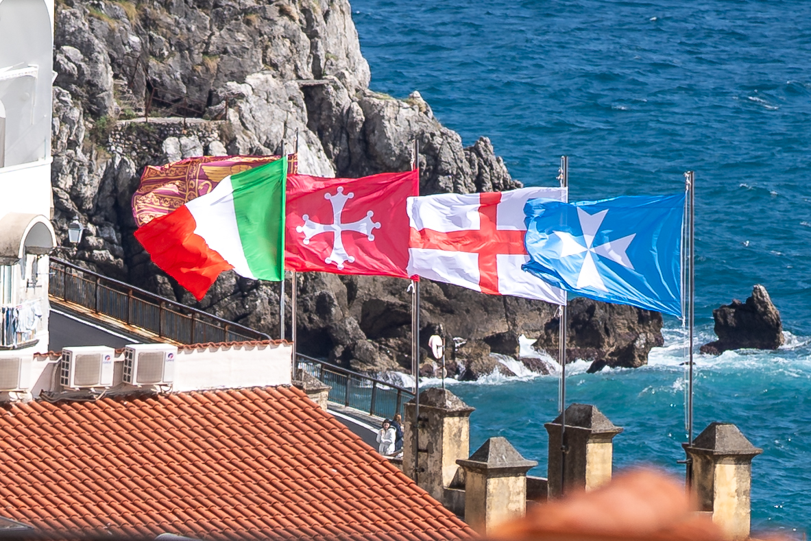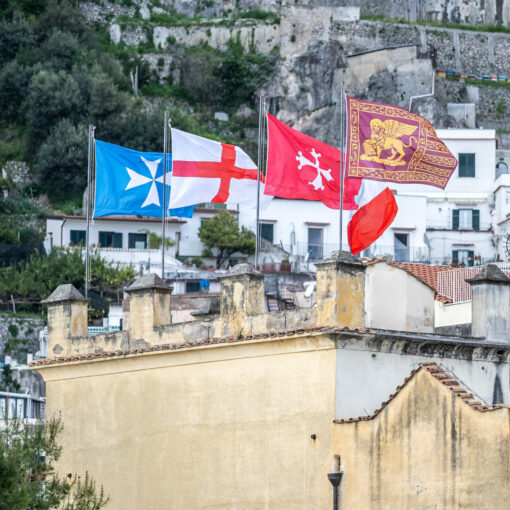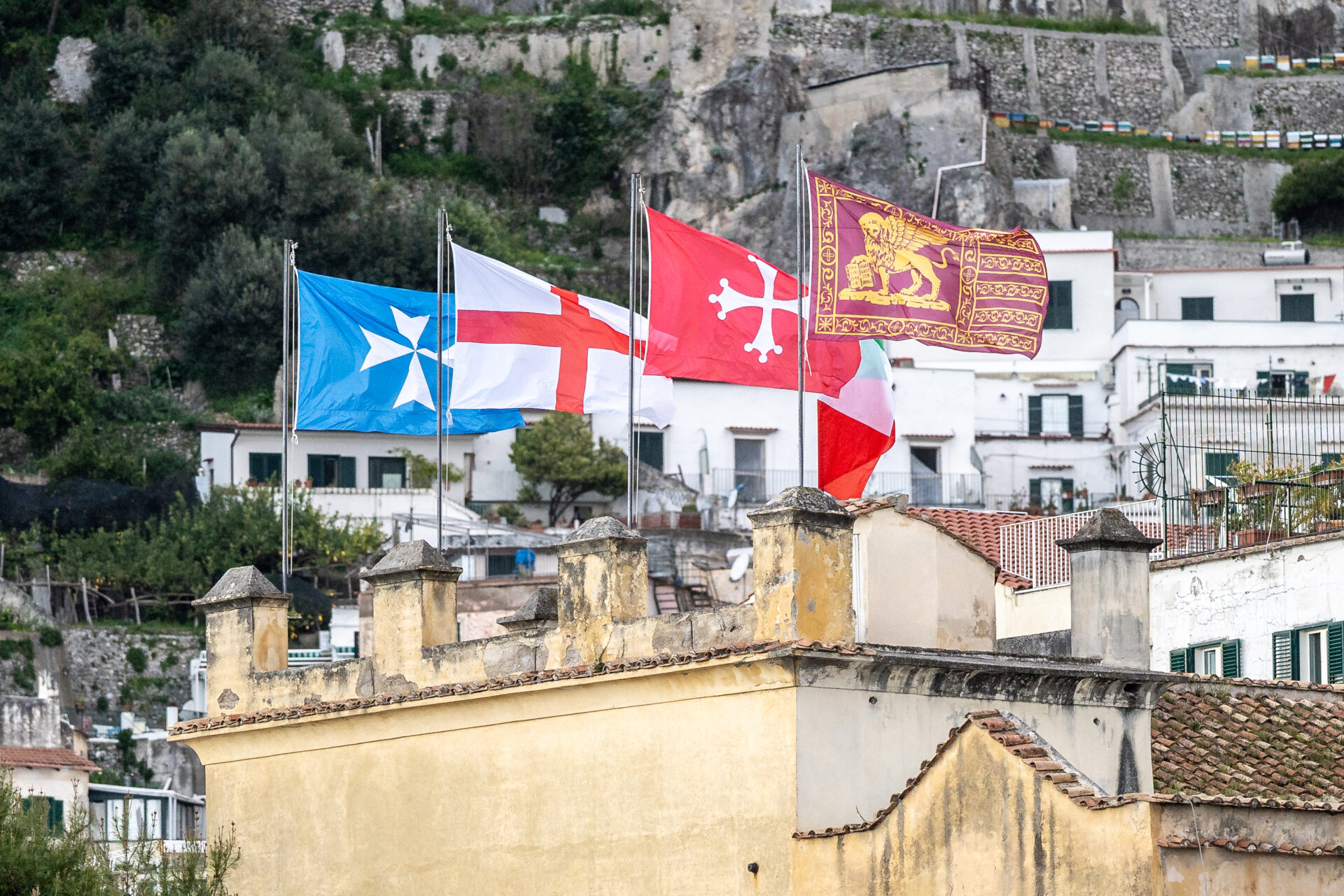 En la torre del Ayuntamiento, que domina la iglesia monástica de San Benito, ondean las banderas de las cuatro repúblicas marítimas, que exhiben sus principales símbolos heráldicos: Amalfi, la cruz octogonal blanca sobre campo azul; Génova, la cruz roja de San Jorge sobre campo blanco; Pisa, la cruz pometeada blanca sobre campo rojo; Venecia, el león dorado de San Marcos blandiendo una espada sobre campo púrpura.
