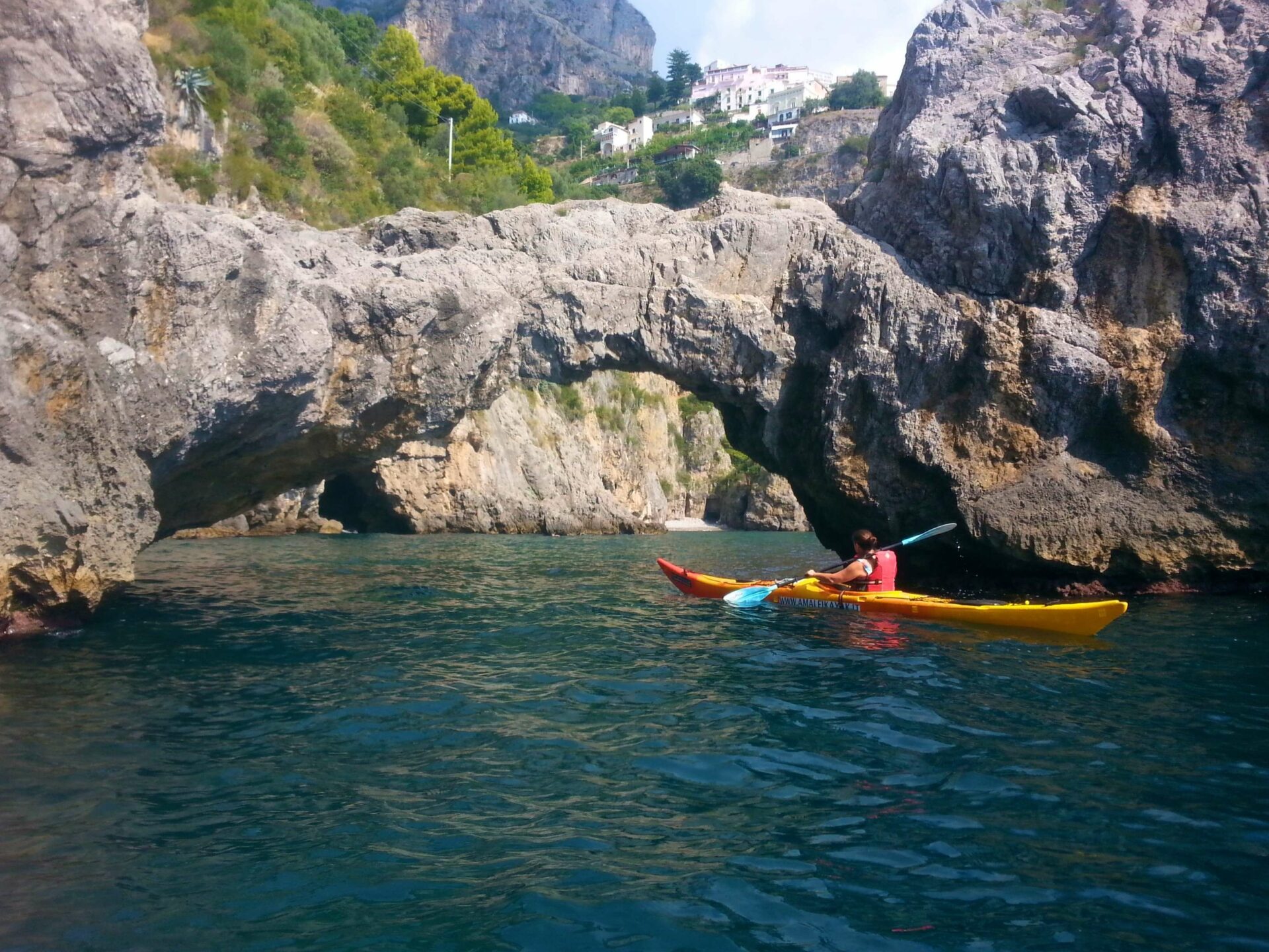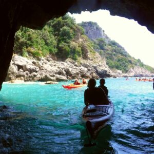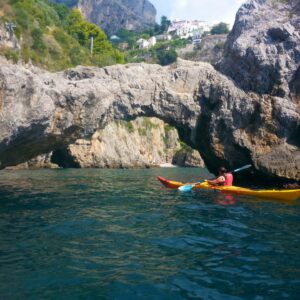 Il tour di Amalfi Coast Sea Kayak porterà alla scoperta della Grotta Runghetiello, una pittoresca grotta marina naturale affrescata dal rosso e dal verde dei minerali che prende il nome da un pesce locale.