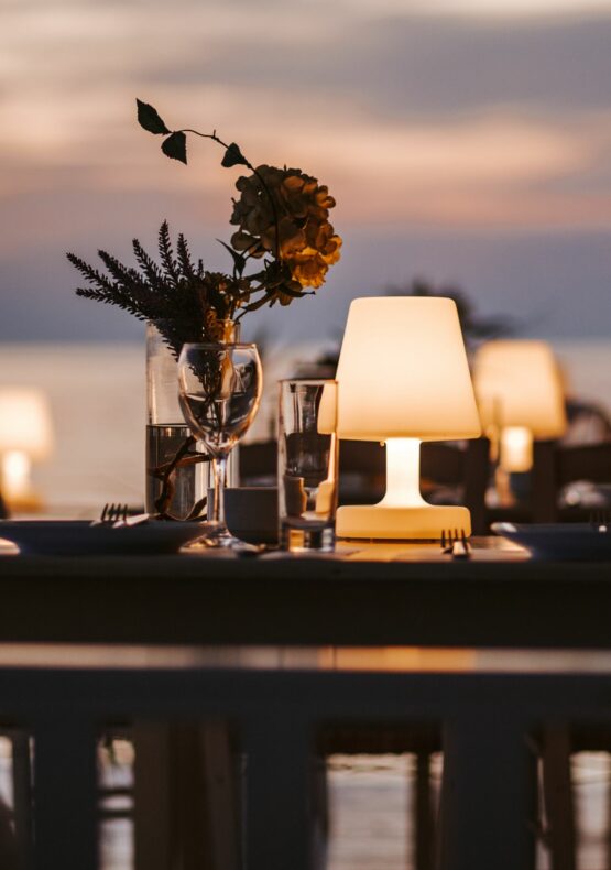 agrémenté de décorations thématiques, de bougies allumées et d’un éclairage doux.