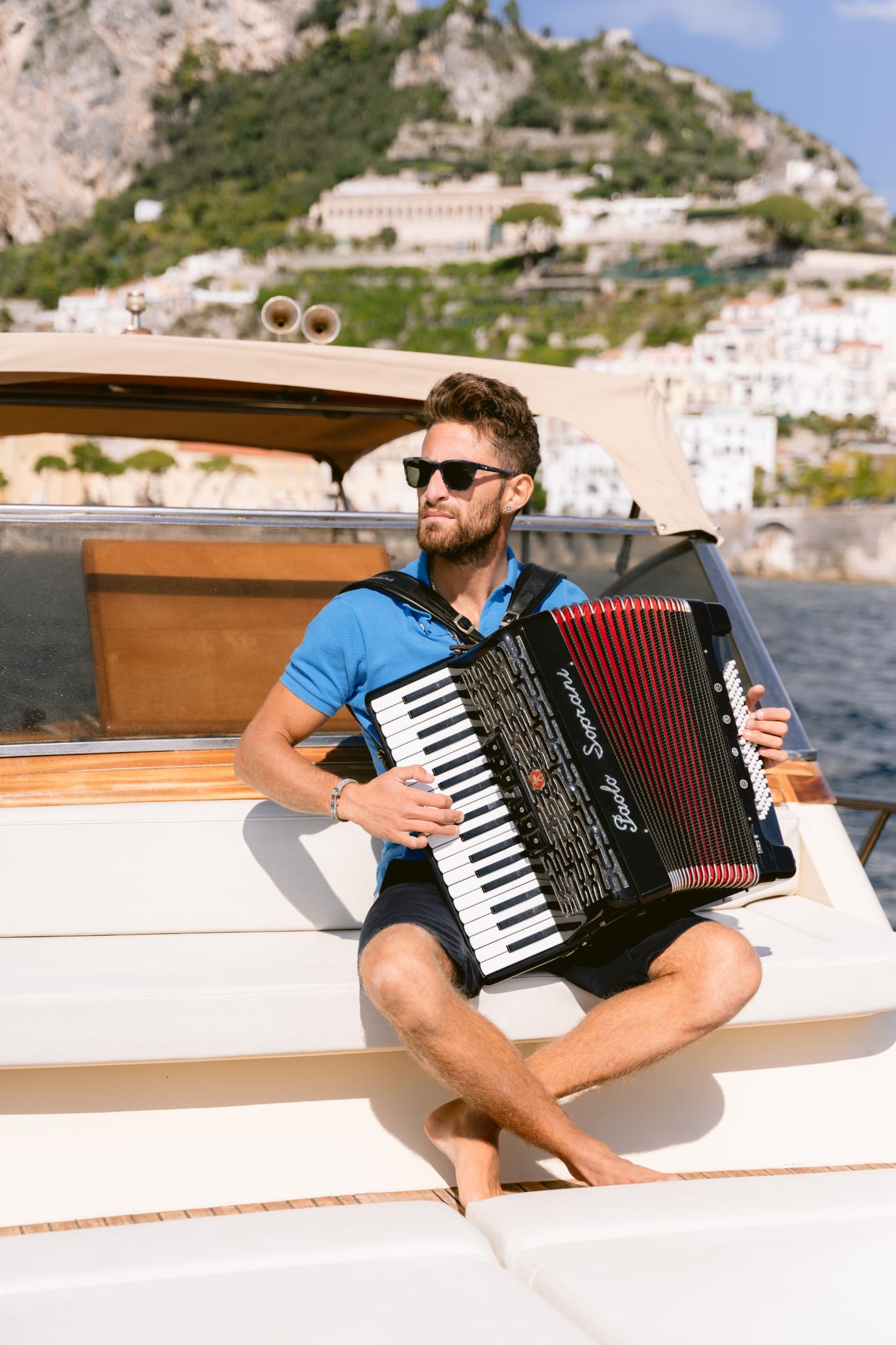 Mario ci racconta che dopo aver terminato gli studi iniziò a lavorare con suo padre, poi altre esperienze con diverse altre realtà fino a quando decise di fare il grande passo: nel 2022 acquista la sua imbarcazione e sceglie di vivere il mare a modo suo accompagnando i visitatori alla scoperta della costa a suon di fisarmonica!