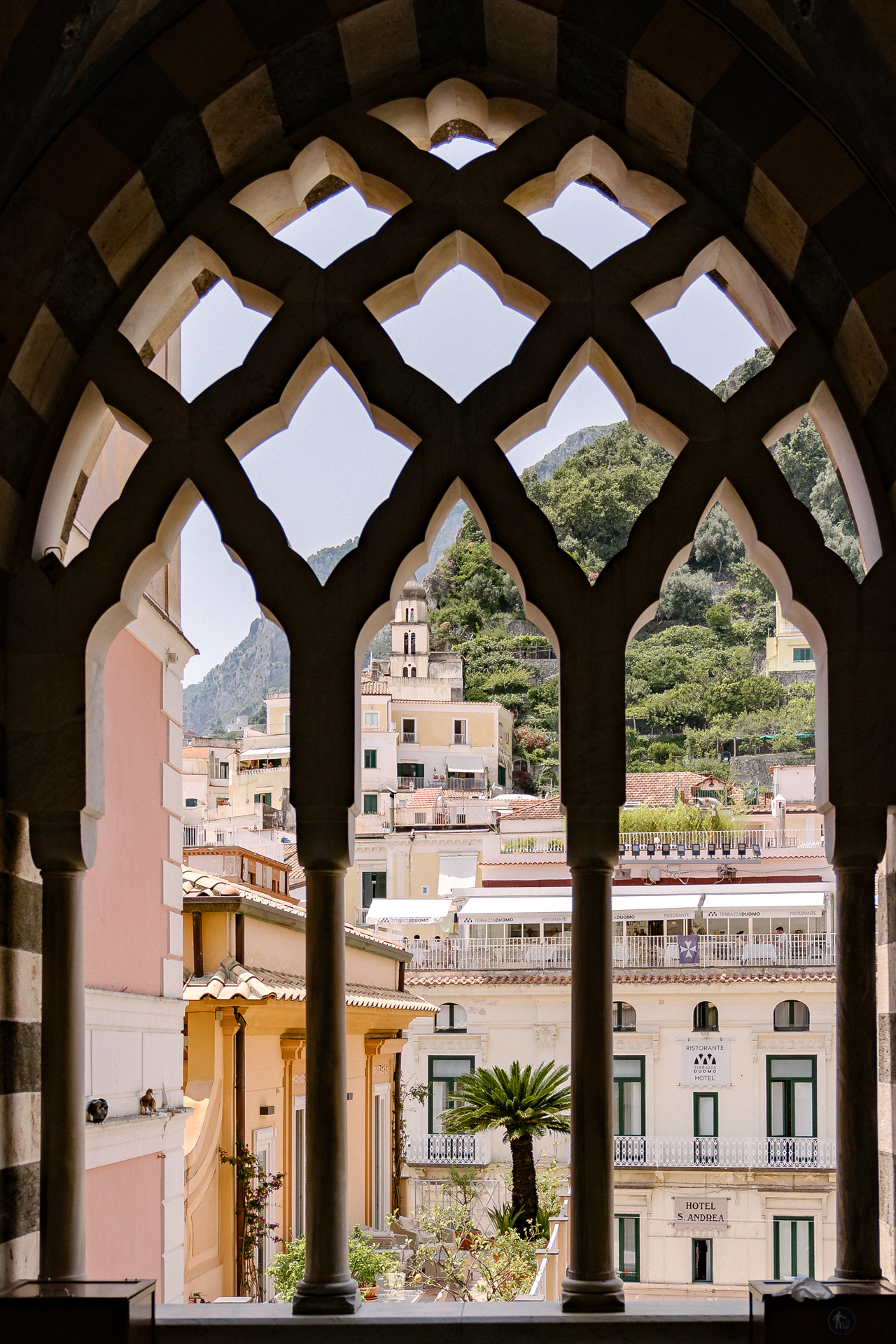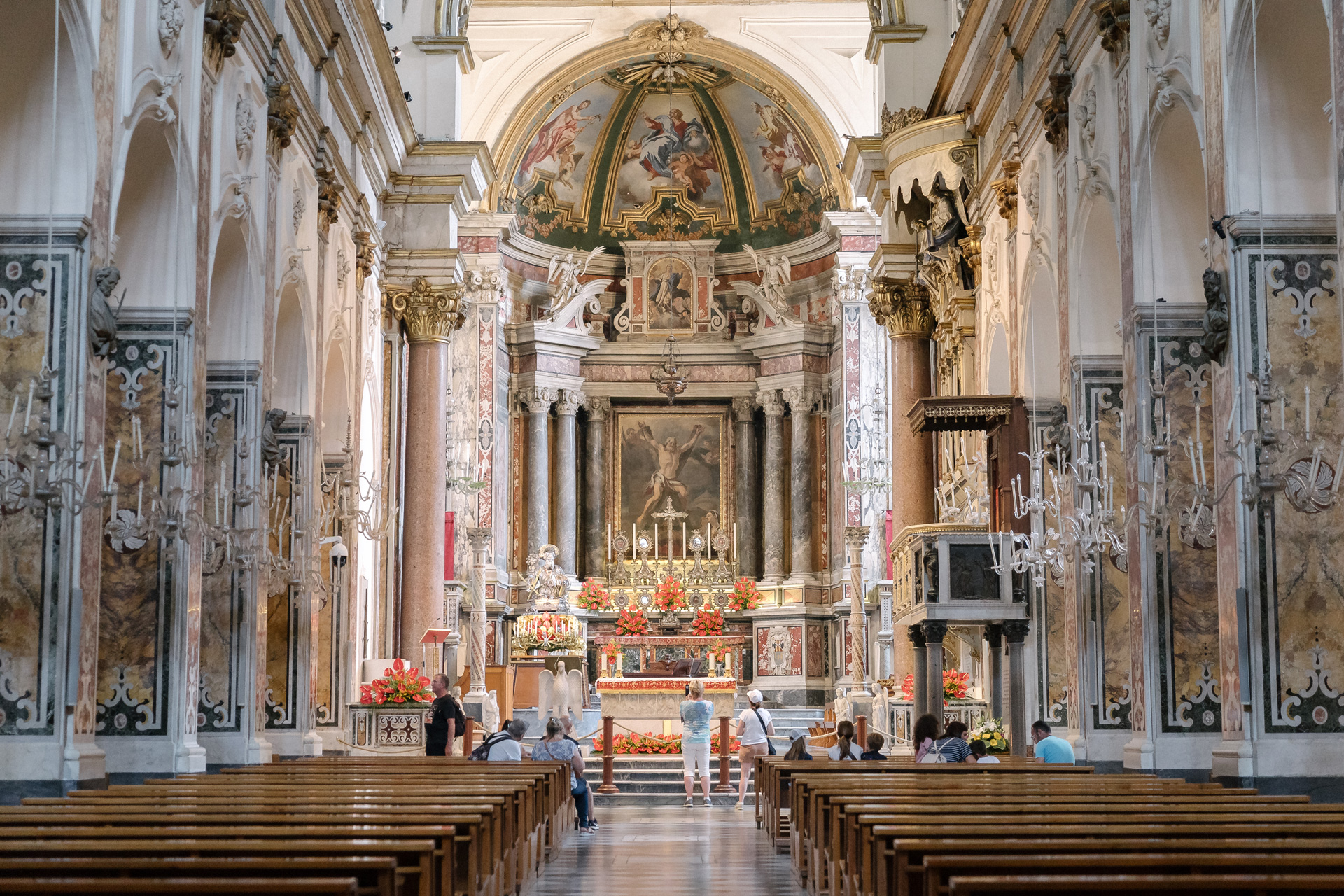 Spicca il portone in bronzo, realizzato a Costantinopoli su commissione di Pantaleone de Comite, mercante amalfitano che omaggiò l’Episcopio nel 1060. All’interno della Basilica, arricchita in chiave barocca nel XVIII secolo, sono conservate le spoglie dell’Apostolo Andrea, a cui sono legati riti, credenze religiose (come quella della Manna) e leggende. Senza dubbio uno dei monumenti più affascinanti di tutta la Costiera Amalfitana, la Cattedrale impera su tutta Amalfi. La facciata attuale neomoresca con influenze neogotiche, recentemente restaurata, è stata costruita nel XIX secolo da un gruppo di architetti guidati da Errico Alvino, dopo il presunto crollo di quella originale. L’atrio della Cattedrale collega il campanile, il Chiostro del Paradiso e la chiesa del Crocifisso.
